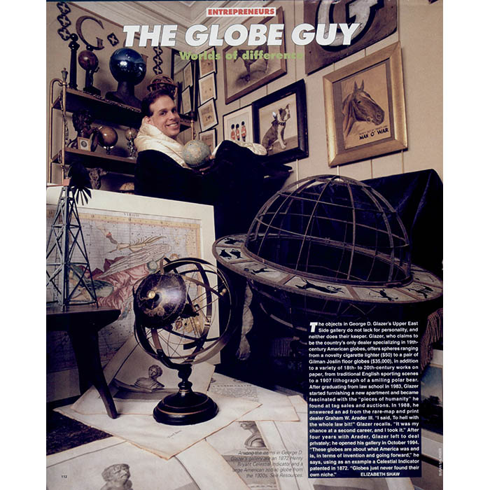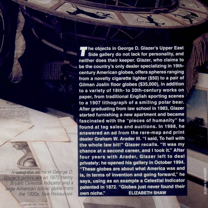 The objects in George D. Glazer’s Upper East Side gallery do not lack for personality, and neither does their keeper. Glazer, who claims to be the country’s only dealer specializing in 19th-century American globes, offers spheres ranging from a novelty cigarette lighter…to a pair of Gilman Joslin floor globes…in addition to a variety of 18th- to 20th-century works on paper, from traditional English sporting scenes to a 1907 lithograph of a smiling polar bear. After graduating from law school in 1983, Glazer started furnishing a new apartment and became fascinated with the “pieces of humanity” he found at tag sales and auctions. In 1988, he answered an ad from the rare-map and print dealer Graham W. Arader III…Glazer recalls, “It was my chance at a second career and I took it.” After four years with Arader, Glazer left to deal privately; he opened his gallery in October 1994. “These globes are what America was and is, in terms of invention and going forward,” he says, using as an example a Celestial Indicator patented in 1872. “Globes just never found their own niche.”