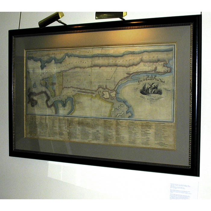 The George Glazer Gallery loaned two early 19th-century maps of New York City to the exhibition Forged by Fire, organized by India House to honor the anniversary of September 11, 2001. The exhibition documents the history of Hanover Square, “New York’s First World Trade Center” and New York’s victory over disaster in previous generations. The centerpiece of the exhibition is an 11-foot iron anchor unearthed during construction of the World Trade Towers in the late 1960s, shown with art and artifacts documenting fires that destroyed large areas of Lower Manhattan in 1776, 1835, 1845 and 1853. These events from New York’s history are presented as an inspiration to Lower Manhattan’s regeneration in the 21st century. One was David Burr’s Map of the City and County of New York: 1832, a large wall map produced when the population of the city was concentrated below 14th Street and the rest was countryside. The other was Plan Of the City Of New York, With The Recent And Intended Improvements Drawn from Actual Survey By William Bridges, City Surveyor, 1807 published by Isaac Riley. See the Burr and Riley maps on our website.