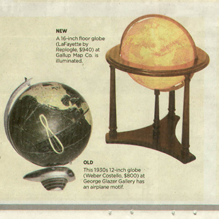 George Glazer was among the globe dealers quoted in the lead article in the Kansas City Star Sunday “House and Home” section about collecting and decorating with globes, and one of the George Glazer Gallery’s black ocean globes with an airplane base illustrated the article. Excerpts below: