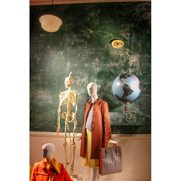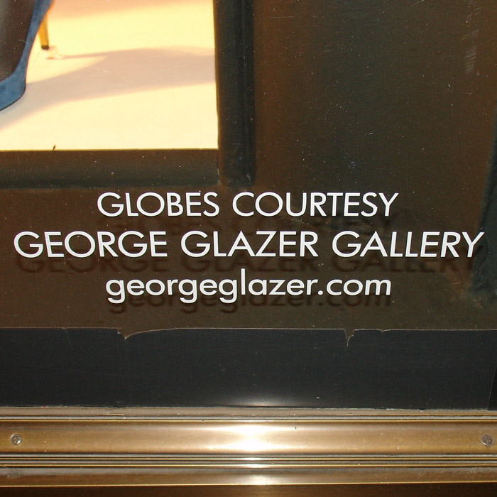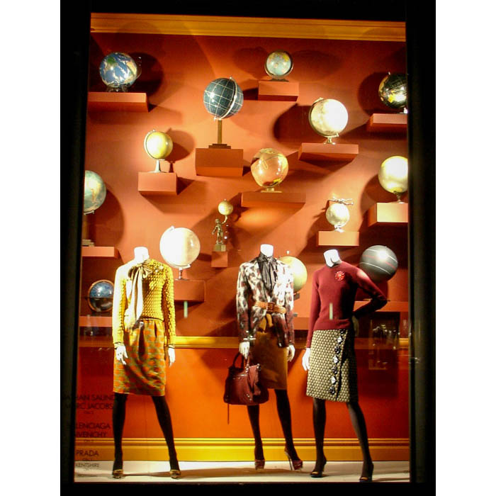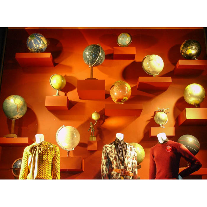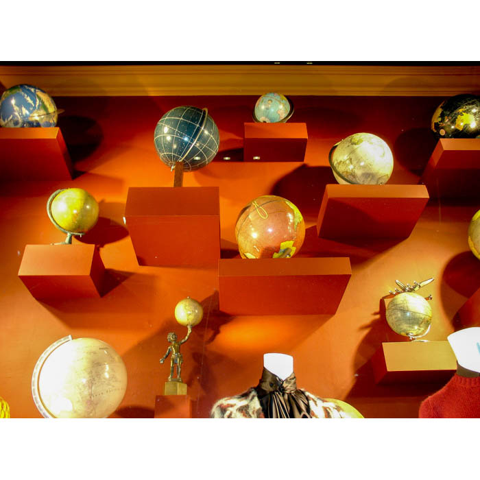 Antique globes from the George Glazer Gallery decorated the windows of Bergdorf Goodman’s flagship store on New York’s Fifth Avenue during August 2012. The store incorporated a variety of terrestrial and celestial table globes as a back-to-school backdrop for clothing by Jonathan Saunders, Marc Jacobs, Balenciaga, Givenchy and Prada.