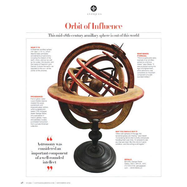 The featured antique in New York Cottages & Gardens’ Fall Style issue is our mid-18th-century armillary sphere by French globe maker Louis-Charles Desnos (magazine page shown left), under the title Orbit of Influence. See it on our site. The full page article quotes George as to “what makes it special”: