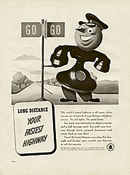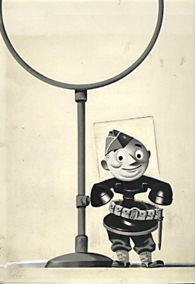 The Bell Telephone System mascot — part man, part telephone — was a company mascot used extensively in advertisements in the 1930s and 1940s. He was featured in various guises, such as a policeman in uniform directing traffic and an academic wearing a mortarboard and carrying a blackboard pointer. In this original drawing, presumably created for an advertisement during World War II, he is shown with army hat and belt.