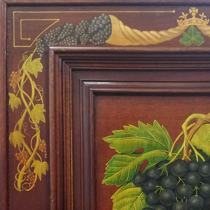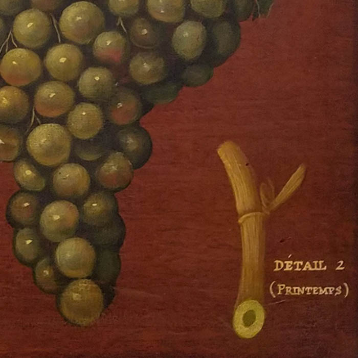 On either side of the lower border of the painting are ribbons commemorating “Medaille d’Or” (Gold Medal) awards for vintages of Premier Cru wines. On the painting of purple grapes the ribbons are labeled “1er Cru/ 1923/ 1929/ 1931” on the left and “Medaille/ D’Or/ Lyons 1929/ Paris 1931” on the right. On the painting of green grapes the ribbons are labeled “1er Cru/ 1924/ 1926/ 1929” and “Medaille/ D’Or/ Bordeaux 1926/ Besançon 1929” respectively. “1er Cru” — Premier Cru — translates as “First Growth,” the term applied to the second-highest classification level of Burgundy wine vineyards, beneath the highest level, Grand Cru. Based on the dates of the awards, presumably these panels were painted in the 1930s.