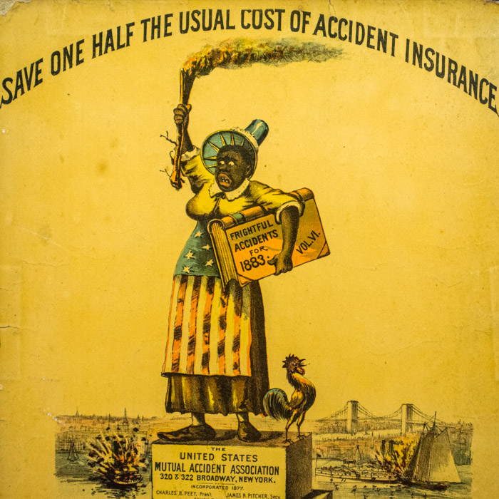 The adoption by United States Mutual Accident Association of the original 1884 Currier “Liberty Frightenin” image for its 1884 or 1886 advertisements apparently reflect a casual acceptance of racist tropes in American popular culture at the time. Nonetheless, is quite plausible that the young insurance company founded in 1877 simply adopted the print for its popularity and relevance to the location of its business in New York City, without searching thought or consideration beyond that. For example, the extensive text advertising their products does not comment on the image. In addition, the design changes reinforce the advertising message — changing the wording on the tablet from “New York Port Charges” to “Frightful Accidents for 1883, Vol. VI” and adding boats on fire in the East River to emphasize their product: accident insurance. Further, the 1884 print changed the parody name Bedbug Island to Bedlum Island, perhaps softening the offensive reference while also making a humorous reference to the “bedlam” associated with unfortunate accidents. Nonetheless, that the insurance company considered it desirable to represent its insurance product with this image speaks to the pervasiveness of racial prejudice in that era. If the inclusion of the accident in the East River seems a crass addition it is somewhat typical for the period in insurance advertisements.