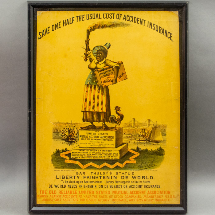 In 1884, Currier & Ives copyrighted the print “Brer Thuldy’s Statue. Liberty Frightenin de World. To be stuck up on Bedbugs Island — Jersey Flats, opposit de United States. Only Authorized Edition.” The variant of this print as an insurance advertisement for the United States Mutual Accident Association (offered here) was created, copyrighted and published by Currier & Ives with a slightly different title: “Bar Thuldy’s Statue. Liberty Frightenin De World. To be stuck up on Bedlum’s Island – Jersey Flats opposite da United States.” The advertisement is also larger than the original version.