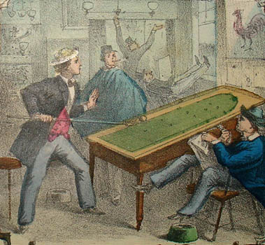 The publisher, Henry Schile, produced many prints aimed at an audience of fellow German immigrants. Inasmuch as Schile was a New York City publisher that frequently published New York City scenes, it is quite possible that the tavern depicted was based on one or more such establishments located there. During the first half of the 19th century there a steady flow of German immigrants into Manhattan, so by 1855, it had the third largest concentration of Germans after Berlin and Vienna. By the 1870s, when this print was published, it has been estimated that German immigrants and their American offspring made up roughly 30% of the population of New York City. Most were concentrated in the Lower East Side’s “Little Germany,” which was also the German cultural capitol of the U.S. (Haberstroh).