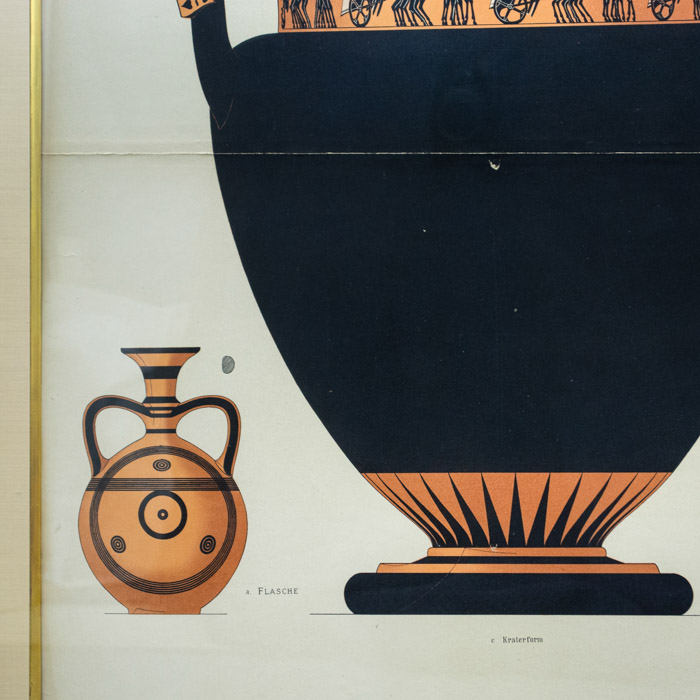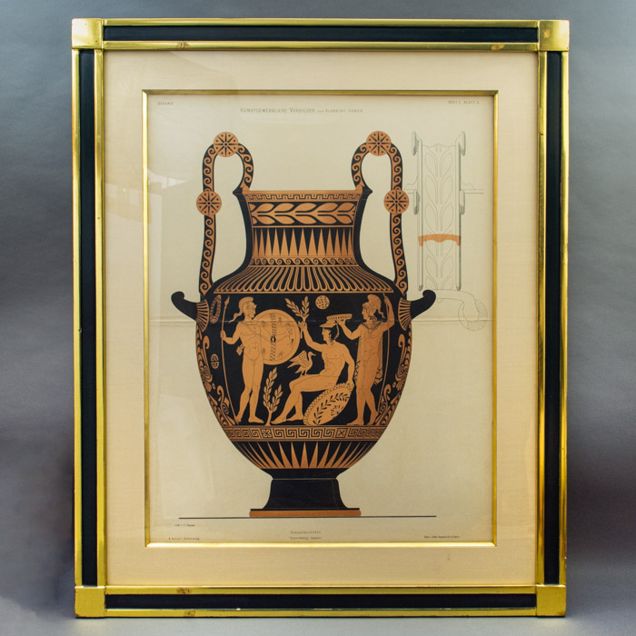 Interest in Greek and Roman architecture and antiquities was spurred among English and European intellectuals and artists during the Enlightenment, and aristocratic tourists made the “Grand Tour” to Italy and the Mediterranean to see these wonders in person. Plates reproducing the fine antiquities collection of Sir William Hamilton (1730-1806) popularized Greek vases and brought them to a larger public. During the last quarter of the 19th century, Albrecht Genick, an architect by training, became a leading German authority on red-figure vases. He published two works about Greek Ceramics, with numerous impressive bold chromolithograph full or double page prints to illustrate them. Griechische Keramik [Greek Ceramics] (Ernst Wasmuth, Berlin: 1883) is Genick’best-known set on the subject. It was preceded by a self-published collection of prints of Greek vases with text, Kunstgewerbliche Vorbilder: Keramik, Gefässformen des klassischen Alterthums. The Architekturmuseum at the Technische Universität Berlin has examples of architectural drawings by Genick that he submitted for monthly competitions in 1867 and 1868.