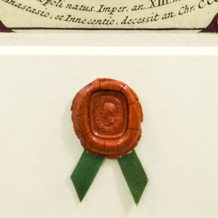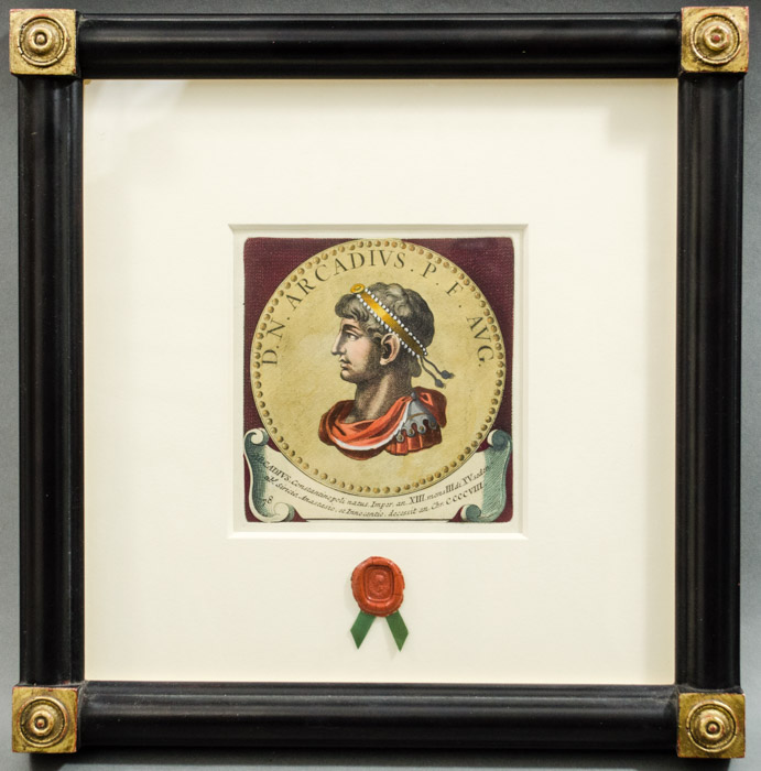 The prints are now attractively framed in the French Empire taste, in ebonized frames with gilt block corners enclosing roundels. The cream-colored mats are each decorated with an antique red wax seal over a green ribbon.