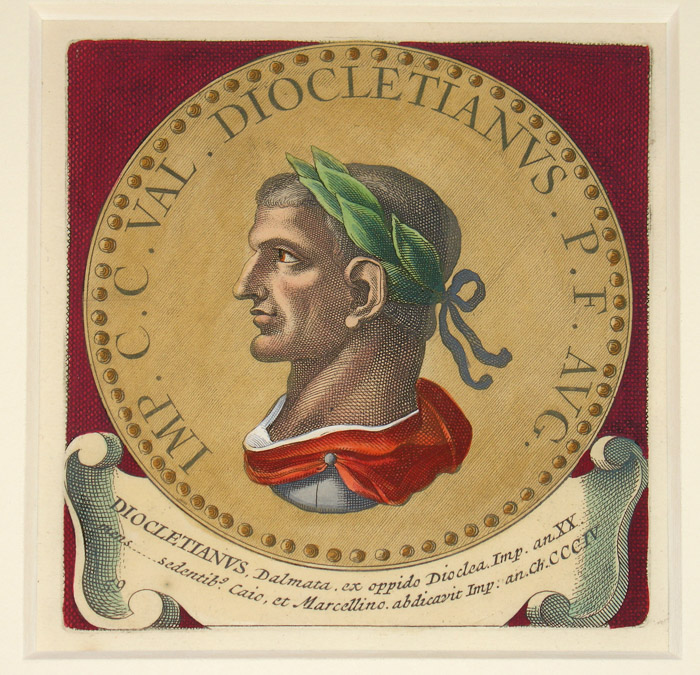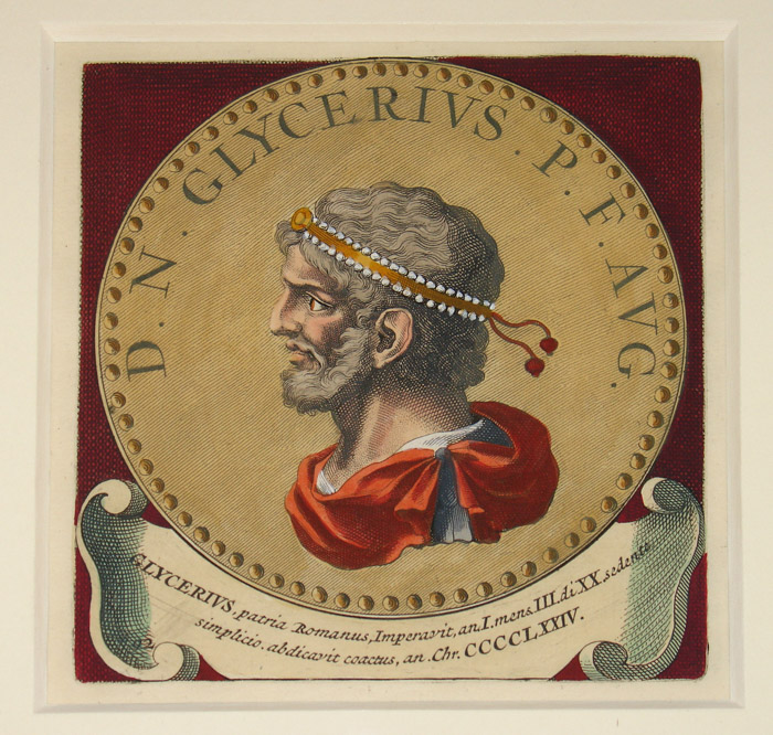 The emperors depicted are from different periods of Roman history from the second to fifth centuries. Gordian I (157-238) served as proconsul in Africa prior to being named co-emperor, at age 81, with his son, Gordian II. Their reign lasted only 22 days in the year 238, when Gordian I committed suicide upon learning that his son had been killed in battle. Quintillus also had a brief reign that ended with his death; he is variously reported to have served 17 days or several months in the year 270. Diocletian (245-313), who reigned from 284 to 305, divided the empire into east and west in order to rule more effectively. He also initiated the last major persecution of the Christians in an attempt to revive the Roman religion. Constantius III was a successful general who was the unofficial ruler of the West from 411 before officially being named emperor in 421; he died a few months later. Flavius Arcadius (c. 377-408) reigned over the eastern half of the Roman Empire from 395 until his death. Glycerius (c. 420-after 480) was one of the last Western Roman emperors, serving only from 473 to 474. He later served as a bishop in the early Catholic Church.