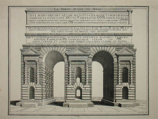 The gate bears three tiers of inscriptions (from top to bottom, as translated by the University of Chicago”). The first inscription credits the Emperor Claudius for building the first aqueduct. The next inscription explains that after nine years of interruption, the Emperor Caesar Vespasian, Augustus, restored the flow of water, and the third explains the later restoration of the wall by Emperor Titus Caesar.