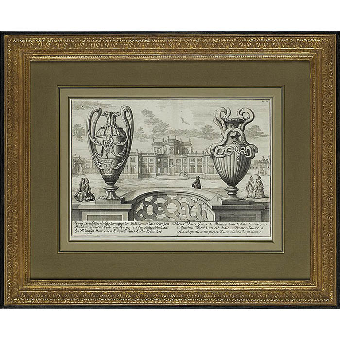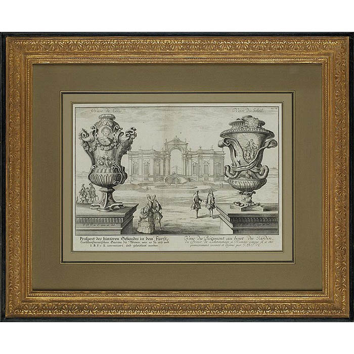 No. 12. Vase de Ceres. Vase du Soleil. Prospect des hinteren Gebäudes in dem Fürst. Liechtenstainischen Garten zu Wienn, wie es zu erst von I.B.F.v.E. inventieri, und gezeichnet worden./ Veüe du Bâtiment au bout du Jardin du Prince de Lichtenstain à Vienne, comme il a été premierement inventé et dessiné par J.B.F.d’E. [Vase of Ceres. Vase of the Sun. View of the building at the end of the garden of the Prince of Lichtenstein in Vienna, how it was first created and designed by Johann Bernhard Fischer von Erlach.]