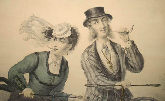 Velocipedes are early bicycles with a slightly larger front wheel than back wheel, first developed in Paris in 1863. A New York Times article from 1869 documents the craze for riding two-wheeled velocipedes, as the cycles were known. Titled “The Velocipede Furor,” the article explains that the Central Park Commissioners had not yet decided whether to allow them into the park, while those of Brooklyn’s Prospect Park had “already taken measures to gratify the army of velocipedists who are preparing to invade the Metropolis and its suburbs this Spring.” The article also reports that American carriage-makers, seeing a business opportunity, were rushing to produce the cycles.