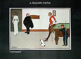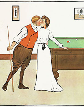 “Kissing” is a term in billiards, where the cueball rests touching the opponent’s ball, as has happened on the table, but that’s not the only kissing going on here. A young Edwardian gentleman steals a romantic moment with his female companion while the little boy’s back is turned.