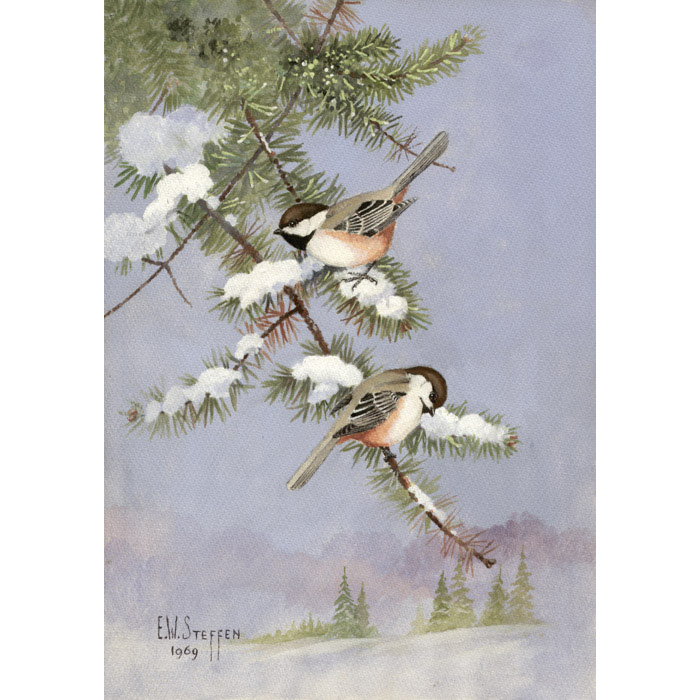 Steffen relied on methodical observation of living birds, as opposed to museum specimens, and designed his family’s house to attract “the birds in order that we may better observe them.” In 1953 he wrote that a bird artist “must know birds. A casual acquaintance is not sufficient. He preferably should have years of careful observation of birds in the field, so he may know how each bird looks in its normal activities.” Steffen’s standards were high and a bird picture did not leave his studio unless it both captured the bird accurately and succeeded aesthetically as a work of art. After retiring in 1956, Steffen and his wife purchased a cabin in Minnesota on Lake Superior, where he made an extensive series of paintings of the local birds.