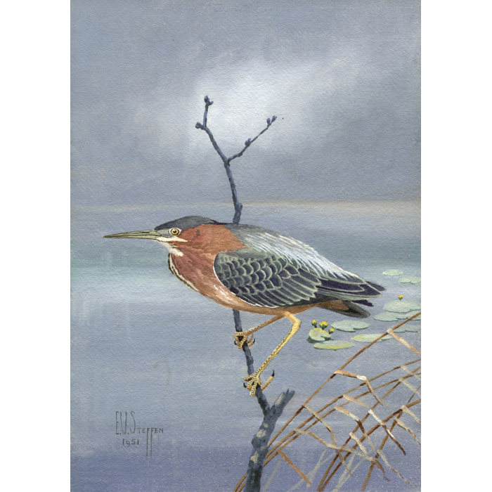 Earnest William Steffen was a noted painter of American birds, based in Cedar Rapids, Iowa, where he was a member of the Iowa Ornithologists’ Union and frequent contributor of essays, pen-and-ink illustrations and color plates to their quarterly journal Iowa Bird Life. His interest in birds began as a boy growing up in Grundy County, Iowa — at the age of 11 he undertook the ambitious project of drawing a representative of each genus of North American birds; this took him a few years to complete. He studied art at Iowa’s Cornell College, graduating in 1915, then served overseas in World War I, surviving an injury that resulted in the loss of several ribs. Around 1932 he embarked upon a series of oil paintings and pencil drawings of the more common birds in Iowa. From 1934 to 1956, Steffen worked as a special education teacher in the Cedar Rapids schools, and during the summers, he and his wife traveled extensively, visiting national parks where he would sketch the birds. By 1944, Iowa Bird Life described him as “a bird artist of ability and is fast gaining a reputation as such” and noted he had completed over 120 oils and between 300 and 400 drawings in his Iowa bird series and was still adding to it.