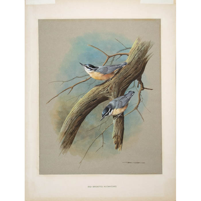 An original watercolor and gouache painting of red-breasted nuthatches by British artist Basil Ede, one of the greatest ever 20th-century ornithological artists. In this beautiful composition, two of these birds perch on a weathered dead branch against a blue sky with foliage indicated impressionistically in the background. This work demonstrates why Basil Ede is so highly regarded as a bird artist: he accomplishes the complex feat of achieving remarkable, almost photographic detail of each of the two birds — their forms, proportions and coloration, as well as the textures of beaks and feathers. The animated pose and expressive eyes of each bird are lifelike and natural, capturing their personalities as sentient creatures, within an artistic composition with similarly detailed tree branches.