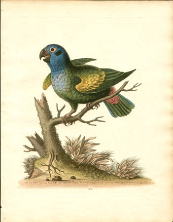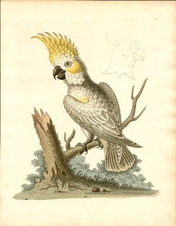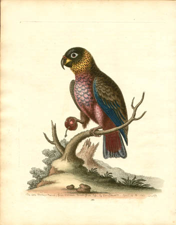George Edwards was born in Essex, England. He studied art in Holland, but found his true vocation in 1718, when he traveled to Norway and studied the birds that lived on the rocks and in precipices. With the materials he had collected, he applied himself to the study of natural history, making colored drawings of birds and animals, and continued his studies in Holland. Edwards also mastered etching with the assistance of the leading 18th Century British natural history artist Mark Catesby (1683-1749). Edwards made considerable contributions to the study of birds, and held numerous positions as a scholar and scientist. Indeed, he is generally considered the father of modern British ornithology. In 1733, he was appointed as Librarian at the Royal College of Physicians. Edwards also served as secretary to Sir Hans Sloane, who had a private museum and was president of the college and of the Royal Society. Edwards was honored with the Gold Medal of the Royal Society and elected a Fellow. His descriptions and pictures of birds provided reference material for the renowned Swedish biologist Carolus Linnaeus (1707-1778), who gave scientific names to 350 bird species described by Edwards.