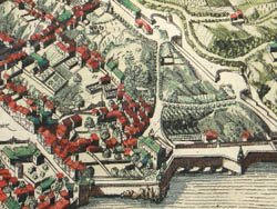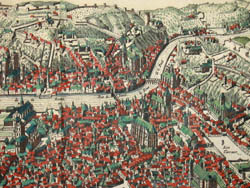 Georg Braun was the editor of Civitates Orbis Terrarum, and Frans Hogenberg the chief engraver. They based their views mostly on existing maps. A large part of their work derived from Theatrum Orbis Terrarum, published in 1570 by the Antwerp cartographer Abraham Ortelius. This work was considered the first modern published atlas. Indeed, Theatrum Orbis Terrarum was in many respects the model for the Civitates, with similarities in titles, as well as the formats, layouts and order of the plates. The accompanying texts were in many cases also based on Ortelius’ work, as Braun indicated in the preface to the first part of the 1572 edition. Braun and Hogenberg also utilized drawings by other artists, notably the Antwerp artist Joris Hoefnagel (1542-1600), who had traveled through most of Western Europe. Jansson acquired the Braun & Hogenberg plates from Abraham Hogenberg (probably Frans’ son).