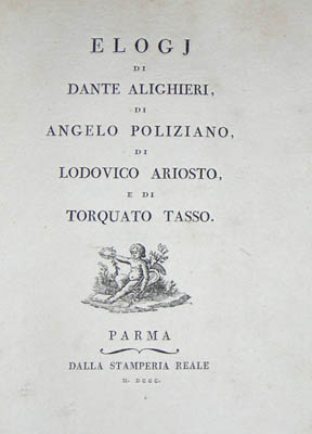 The book is dedicated to the Ferdinand, “Infantado” of Spain, Duke of Parma, Piacenza, and Guastalla, who maintained the area under Spanish Bourbon rule from 1763. Parma became a center for European culture in the late 18th century. In 1797 the French armies invading Northern Italy set up satellite republics throughout the area, but left Ferdinand’s lands alone because Spain was a French ally. However in 1801, the year after this book was published, Ferdinand ceded the Duchies of Parma, Piacenza and Guastalla to France.