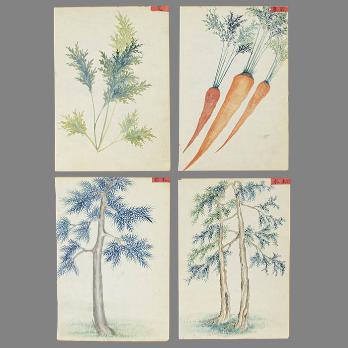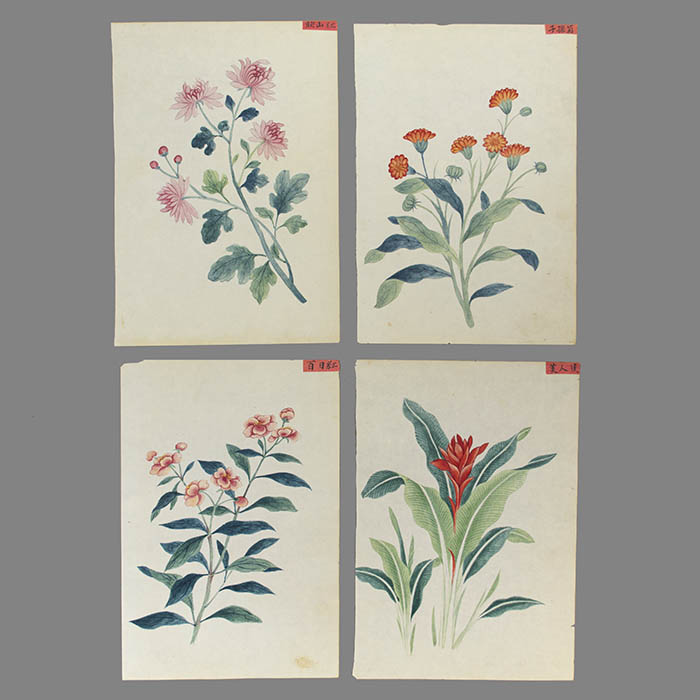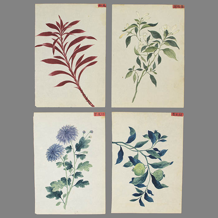 A large collection of colorful watercolor natural history studies of flowers, fruits and vegetables, trees and bamboo painted by Chinese artists from nature. They are from an album identified as having been given to an American named Dr. J.R. Riley in 1850 in Fushan, China (then known as “Fuchan”) and then passed on to descendants. Each has an applied small red label in the top right, with Chinese letters, identifying the specimen illustrated. Some of the species are identified in pencil on the back sides of the paintings in English or Latin. They might have been intended for sale for export.