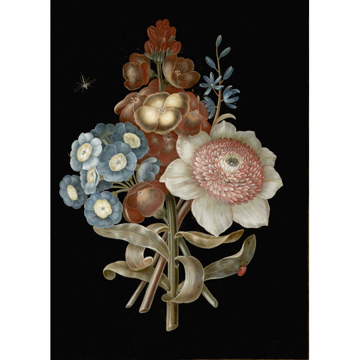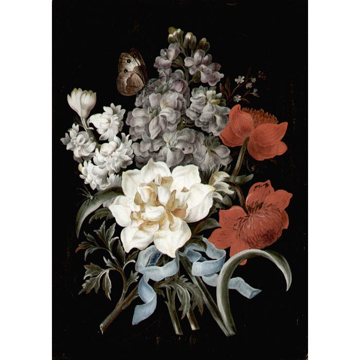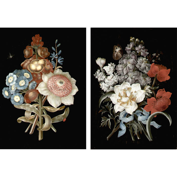 Barbara Regina Dietzsch was a painter of flowers and animals. Born in Nuremberg, she was the daughter of painter Johann Israel Dietzsch (1681-1754) and her brother and sister were also painters. 18th century Nuremberg was a major publishing center, and like other female flower painters working there, Dietzsch produced work to be translated into engravings. Based on extant examples of her work, she apparently was prolific as a painter as well, adopting a smooth and precise style in which highly decorative arrangements of colorful flowers were rendered against a dark background on vellum. Sometimes she painted bouquets and sometimes a single plant. The offered pair is typical of her bouquets — ribbon-tied still life compositions, various insects such as beetles or lady bugs on the flowers or leaves, and translucent flying insects, all against a dark backgrounds.