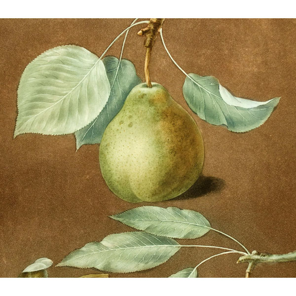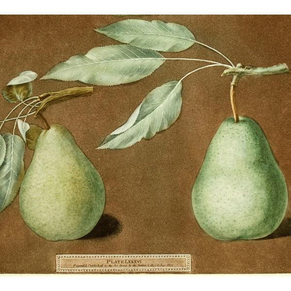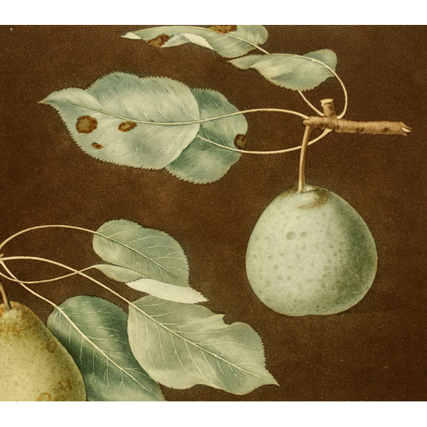 The folio and quarto editions of Brookshaw maintained a high quality of printing, employing the color-printed stipple method, which approximates the supple coloration, tones and textures achieved with watercolor painting. However, the folio version and the quarto version differ in various respects besides size. The folio illustrations are somewhat bolder, against dark brown backgrounds that accentuate the fruit as it seems to “jump off the page.” In contrast, the quarto edition prints are more spare and delicate against light backgrounds. Another difference is that the folio includes melons on ledges and pineapples, while the quarto does not. It may be posited that the style of the quarto plates are related to Brookshaw’s other vocations as an author of drawing instruction books and designer of painted furniture. Perhaps they were intended to serve as illustrations that would lend themselves to copying in watercolor for drawing practice or as models for decorative arts designers.