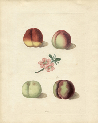 The folio and quarto editions of Brookshaw maintained a high quality of printing, employing the color-printed stipple method, which approximates the supple coloration, tones and textures achieved with watercolor painting. However, the folio version and the quarto version differ in various respects besides size. The folio illustrations are somewhat bolder, against dark brown backgrounds that accentuate the fruit as it seems to “jump off the page.” In contrast, the quarto edition prints are more spare and delicate against light backgrounds. Another difference is that the folio includes melons on ledges and pineapples, while the quarto does not. It may be posited that the style of the quarto plates are related to Brookshaw’s other vocations as an author of drawing instruction books and designer of painted furniture. Perhaps they were intended to serve as illustrations that would lend themselves to copying in watercolor for drawing practice or as models for decorative arts designers.