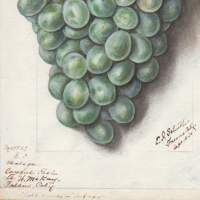 Inscriptions, Malaga Grapes: Signed lower right in ink: “E.I. Schutt — Fresno Calif. Sept. 12-’10. Inscribed lower left: No 49927 S.3. Malaga — Careful Pack. A.H. McKay — Fresno, Calif. Hold 2 weeks in iced car. Orange: Inscribed in pencil, lower right, “1618.”