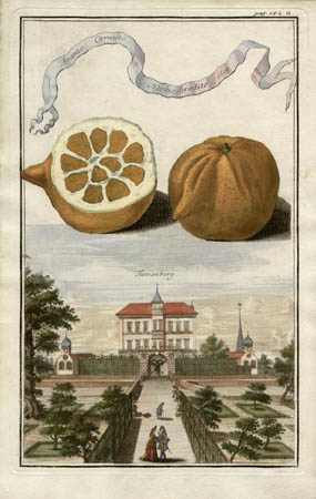 Full Title: Nürnbergische Hesperides, oder gründliche Beschreibung der Edlen Citronat, Citronen und Pomerantzen-Früchte …Auf das accurateste in Kupffer gestochen, in Vier Theile eingetheilet und mit nützlichen Anmerckungen erkläret. Beneben der Flora, oder Curiosen Vorstellung Verschiedener raren Blumen … Wie auch einem Bericht von denen in des Authoris Garten stehenden Columnis Milliaribus