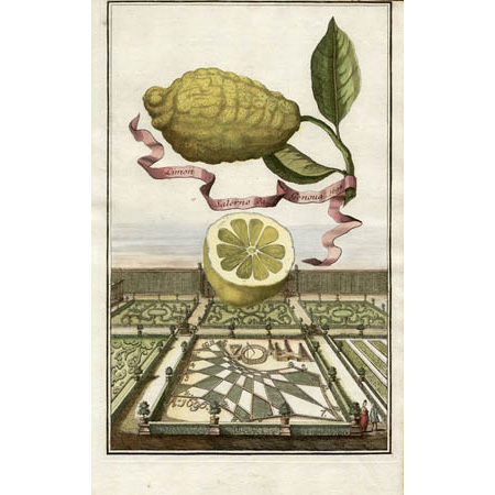 The prints follow a distinctive artistic format in which the fruit or flowers are displayed in monumental scale in bird’s-eye views above landscapes of the formal gardens, palazzos and country houses where they were grown. Fruits are generally shown flying in the sky, though sometimes other compositions are employed, such as oversized plants towering over Lilliputian landscapes. A floating ribbon wrapped around each specimen bears its name. The gardens shown are in Germany, Austria and northern Italy, especially around Verona, and include Volckamer’s garden, Gostenhof. These compositions are described by scholar Sandra Raphael as follows: “The fruit and gardens in most of the plates – spherical oranges, lemons, and citrons drifting like eccentric balloons above miniature landscapes – make pleasingly surreal compositions….”