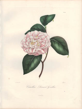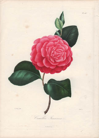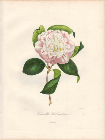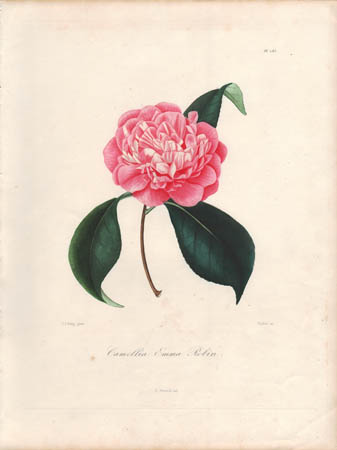 The Abbe Laurent (or Lorenzo) Berlèse was a wealthy Italian abbot who carried out his botanical studies in Paris, where he established his own greenhouses. The camellia, which originated in China and Japan, was still something of an exotic plant. First reported in European scientific literature around 1700, travelers to Asia brought back cultivars during the 18th century. The first illustrations from live specimens, by British natural history artist George Edwards, appeared mid 18th century. Berlèse’s achievement was the establishment of a classification system for camellias based on the flower form. By the third of edition of his Monographie du Genre Camellia (1837-1840) he listed 701 varieties. He followed this work with the influential Iconographie du Genre Camellia, a major three-volume study of 300 varieties (the source of these prints). In 1846, he sold his camellia collection to a commercial grower, returned to Italy and published no further works on the subject.