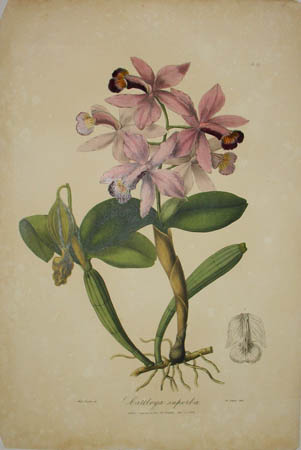 Large Victorian orchid prints by the distinguished British botanist John Lindley, among the foremost orchidologists of his era.  Sertum Orchidaceum, one of his major works, was issued in ten parts between 1837 and 1841 (the publication date on the title page is given as 1838), just as orchid cultivation was becoming fashionable among the aristocracy leading to what has been called “orchidomania.”  Illustrated books on orchids remained very popular through the second half of the 19th century and in some cases provide the only record today of extinct species.  The artist Sarah Ann Drake — “Miss Drake” as she was known — and Maxim Gauci, who translated her drawings into lithographs, are still highly regarded for their botanical illustrations, especially of orchids.