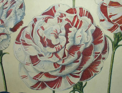 Scholar Rodney King described this print as follows: “Carnations are cultivated forms of Dianthus caryophyllus. Many varieties have been bred such as those shown in this picture, which was painted by Peter Henderson. These belong to what are called ‘florist’s flowers,’ that is, varieties conforming to certain recognized standards. Those with broad stripes of one colour were classed as ‘Flakes’: the Flakes in this group were named by Thornton ‘Palmers’s Dutchess of Dorset’ and ‘Palmer’s Defiance’. Those with stripes of two or three colours were known as ‘Bizarres’: Thornton called the Bizarres in this group ‘Caustin’s British Monarch’ and ‘Midwinter’s Dutchess of Wurtemburg.’ Those with toothed and coloured edges to the petals were ‘Piquettes,’ in this case ‘Davey’s Defiance’ and ‘Princess of Wales.'” (Ronald King. The Temple of Flora by Robert Thornton. 1981, p. 60).