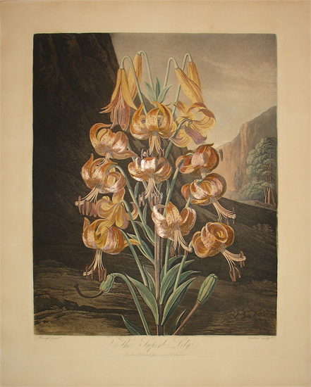 Robert John Thornton began his career as a doctor. In 1797, he opened a successful practice in London. Meanwhile, he had become deeply interested in botany under the influence of Thomas Martyn’s lectures and the writings of Linnaeus. In 1797, he also began advertising for subscribers to his planned natural history publishing venture, which eventually became known as The Temple of Flora, comprised of 30 folio botanical plates (generally issued with just 28), as well as two classical allegorical plates. It was originally published as the third section of an extensive and ambitious botanical publication titled New Illustration of the Sexual System of Linnaeus.