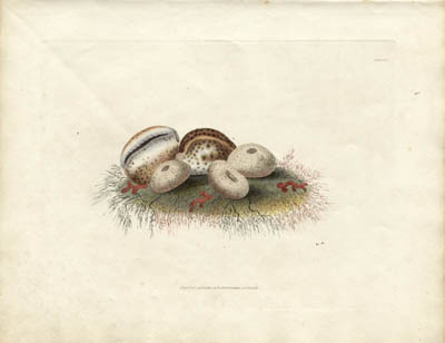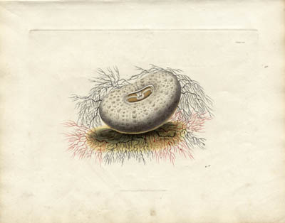 Set of eight prints, each a naturalistic still life design incorporating seashells or other marine organisms, resting on a small, colorful patch of delicately rendered seaweed. Through a method developed by the great French botanical artist Pierre-Joseph Redoute in 1796, the colors were applied to the etched plate a la poupée before each printing, giving the soft, subtle and freehand effect of a watercolor.