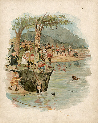 Palmer Cox introduced his Brownie characters in 1883, and parlayed them into a tremendous publishing and merchandising success. Growing up in Granby, Quebec, in Canada, Cox’s family told him Scottish folktales about brownies, members of the fairy world who help with house and farm chores while the household sleeps. Cox’s own charming and whimsical rendition of these sprites evolved into a series of 13 books, in which he developed a cast of over 40 of Brownies with distinct features and personalities. He also licensed his characters to major advertisers such as Ivory Soap and for the manufacture of a broad range of commercial products: postcards, toys, games, printed muslin stuffed doll kits, carpets, wallpapers, school supplies, complete dinner sets and calendars. Perhaps the most famous marketing tie-in was the Brownie camera, which Eastman-Kodak devised as a simple camera for children and initially marketed with Cox’s characters in its ads.