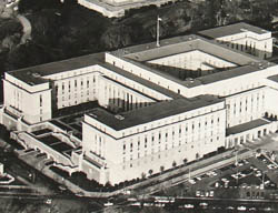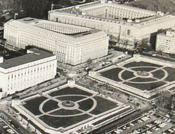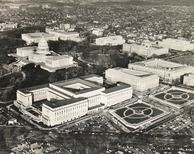 Capitol Hill is not dominated by the Capitol itself, as one might expect, but by the massive Rayburn Office Building (foreground), an $86-million mass of stone, steel, and congressional prerogatives that “Fortune” magazine called “A Monument to Power.”  Behind it are the other two House office buildings, then the Library of Congress and its Annex, the Supreme Court, and the two Senate office buildings.  In the center is the Capitol on a site selected in 1791 by President George Washington and Major Pierre Charles L’Enfant, a French architect who fought in the American Revolution.  L’Enfant planned the District of Columbia with broad boulevards, marble buildings, and beautiful fountains, all patterned after his beloved Paris.