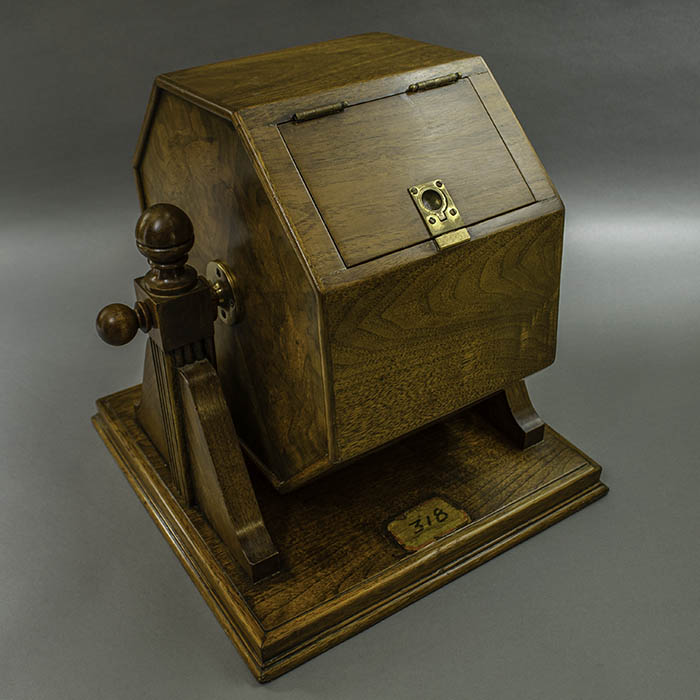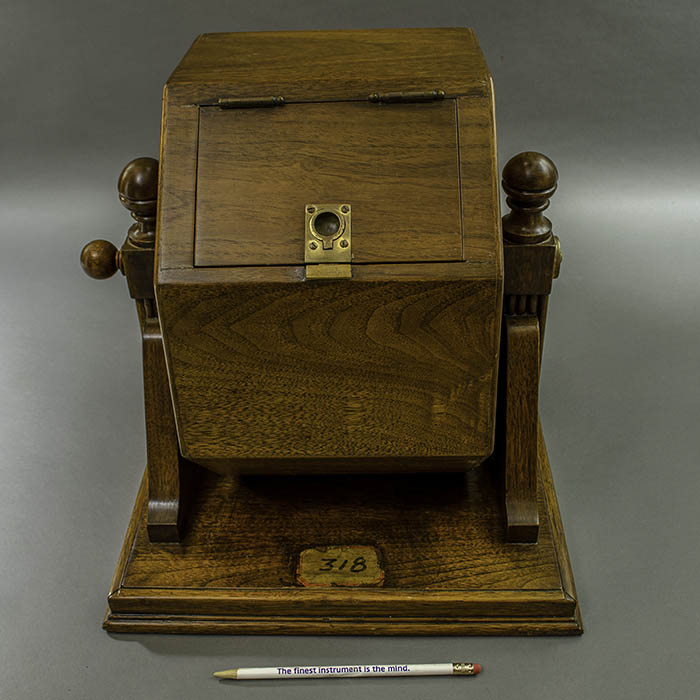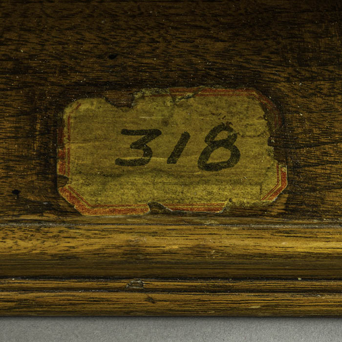 Condition: Generally very good, with a handsome finish and patina to the wood, having the usual expected overall wear from handling. Old paper gummed label with the number 318 a bit soiled and worn with light dampstain, and minor chipping to outer edges, but quite intact.