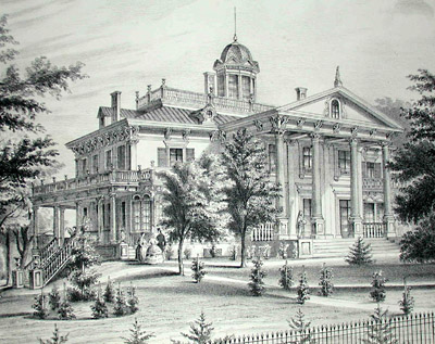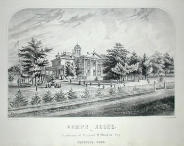 A view of Compo House in Westport, Connecticut, the home of Richard Henry Winslow, who served the 10th district in the Connecticut State Senate circa 1860. The mansion appears on carefully landscaped property with an iron gate running along the length of a dirt road. The building apparently no longer exists — it was on what is now Winslow Park, a public park and bird sanctuary. The Winslows also owned the land across the street from the park that is now called Baron’s South.