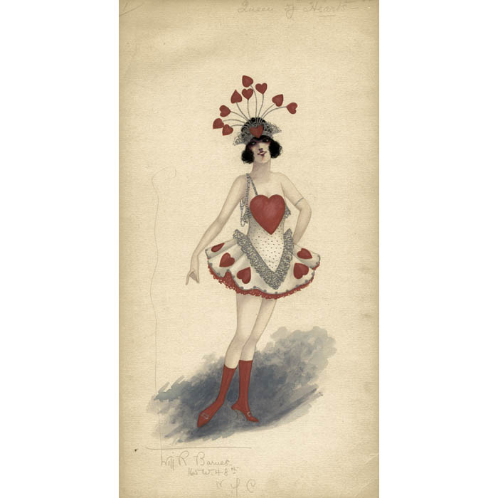 Will R. Barnes designed costumes for numerous Broadway productions between 1898 and 1924. Born in Australia, he came to the U.S. in the late 1890s and began designing costumes for a number of Joe Weber and Lew Fields’s Music Hall shows. Later he worked with the designers Cora MacGeachy and William Henry Mathews on the Hippodrome spectacles until the final show there in 1922. Barnes specialized in costumes for the lighthearted musical entertainment that was extremely popular at the time: musical comedies, operettas, revues, vaudeville productions and burlesques. The best known of these productions today is probably Naughty Marietta, which was scored by Victor Herbert. Art historian Stefanie Munsing Winkelbauer notes that Barnes’s designs show a predilection for striking contrasts and bold pattern. The National Library of Australia and the New York Public Library have large collections of his costume designs. Barnes also was known for his watercolor landscapes.