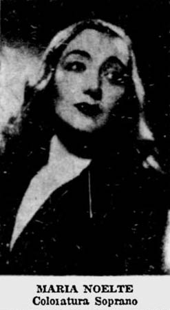 Maria Noelte was a coloratura soprano from Chicago. From 1944 to 1945, she performed in concert in the New York area, her first recital at Town Hall. She performed “The Bell Song” from Delibes’ Lakmé in the Naumburg Orchestral Concert series in New York’s Central Park in 1944 for a Memorial Day concert which marked the 20th year that concerts were arranged by the sons of Elkan Naumburg, who had donated the bandstand on the Mall in 1922. She also performed “The Bell Song” as the featured performer at a benefit concert in Darien, Connecticut, in 1945, and was reviewed in the local newspaper: