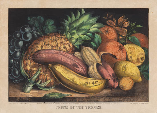 Bountiful still life of tropical fruits on a tabletop, emphasizing the rounded forms.  Piled together are a pineapple, red and yellow bananas, oranges, lemons and grapes.  Such still lifes were a popular theme for Currier & Ives, featuring fruits of different seasons, fruit vases or fruits and flowers.  At least 40 such prints were produced.