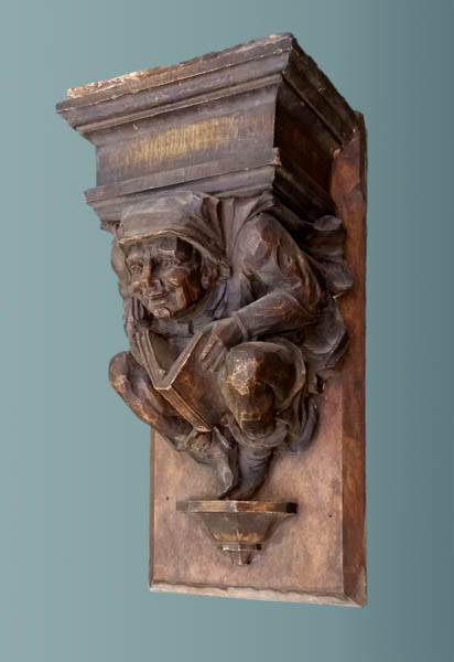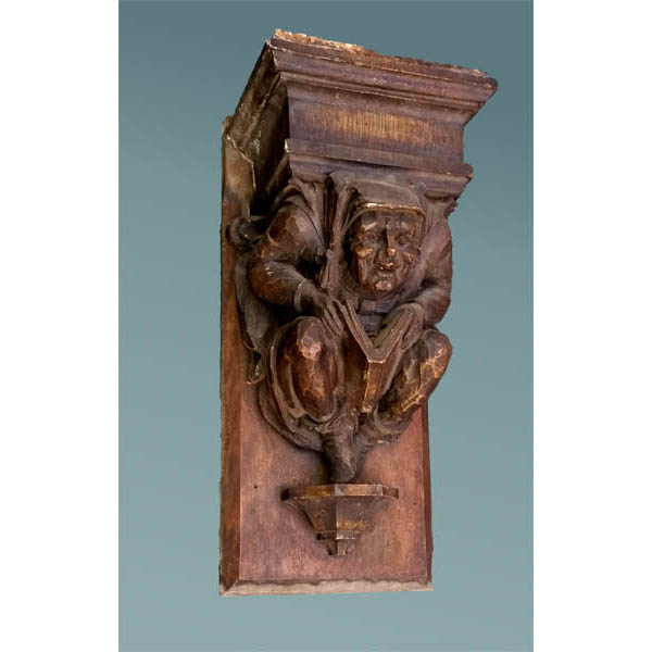 A decorative corbel of a medieval man reading a book and kneeling while he supports a small classical molding. It is made of plaster painted with a faux wood finish and mounted on a wooden backboard. It was probably designed as a decoration to be hung high in a library. The design was apparently inspired by early medieval English and Continental church architecture that incorporated gargoyles as water spouts to convey rainwater off the building and by various so-called ornamental grotesques. These included an array of odd human and animal figures, as well as mythical and imaginary creatures. They are thought to have been “guardians” of the building to ward off evil spirits or to show the power of the church. In more modern times, they are often viewed as whimsical architectural elements. In the offered corbel, the man is portrayed more as an amusing bookish scholar rather than a grotesque.