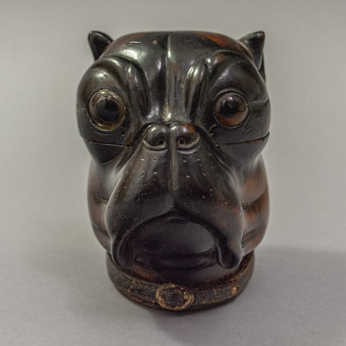 A charming inkwell in the form of a bulldog head with bright eyes that opens with the top of the head on hinges to reveal a brass cup with a hinged domed cap. The bulldog is realistically carved of lignum vitae wood with dark stained or painted highlights. It has orange glass eyes with black pupils and wears a leather collar. The interior brass cup originally held a simple open glass bottle insert for the ink, now lacking.