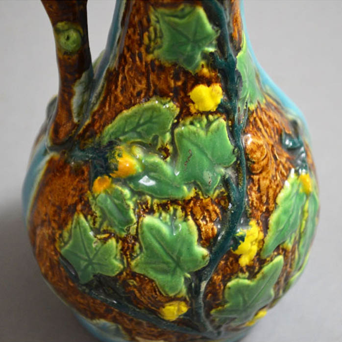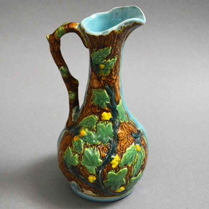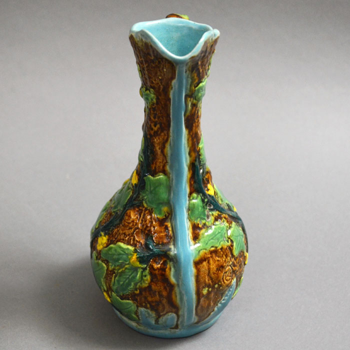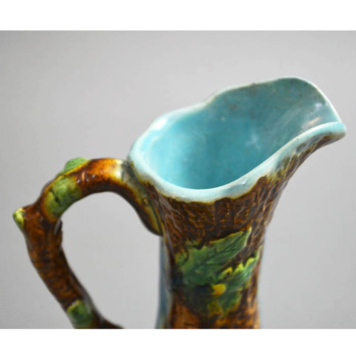 A tin-glazed pitcher, of stylized naturalistic form with textured brown tree bark ground, raised relief vine leaf design, and a  brown branch form handle. It is partly glazed in light blue, including the inside.