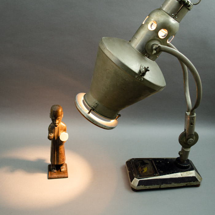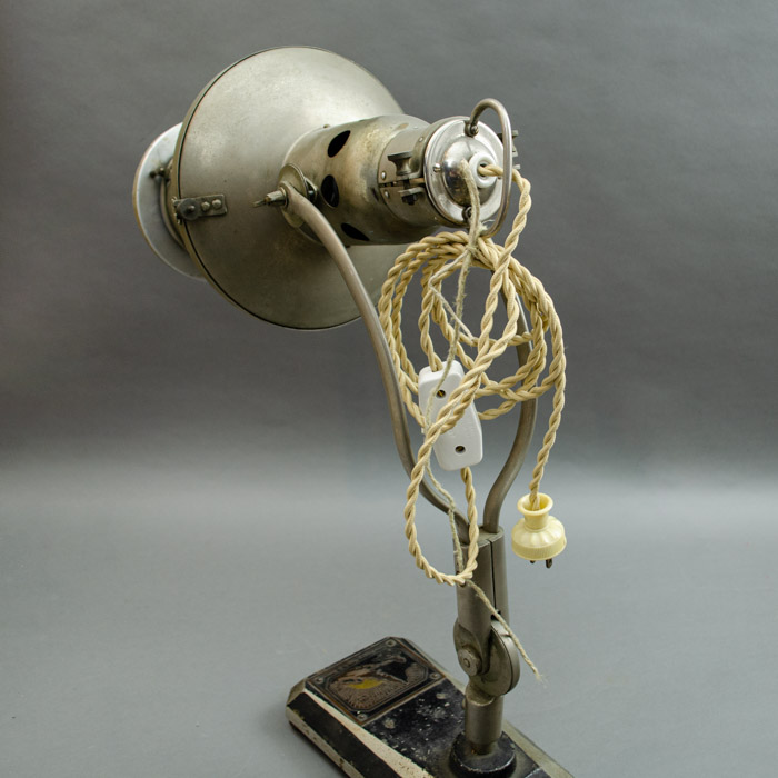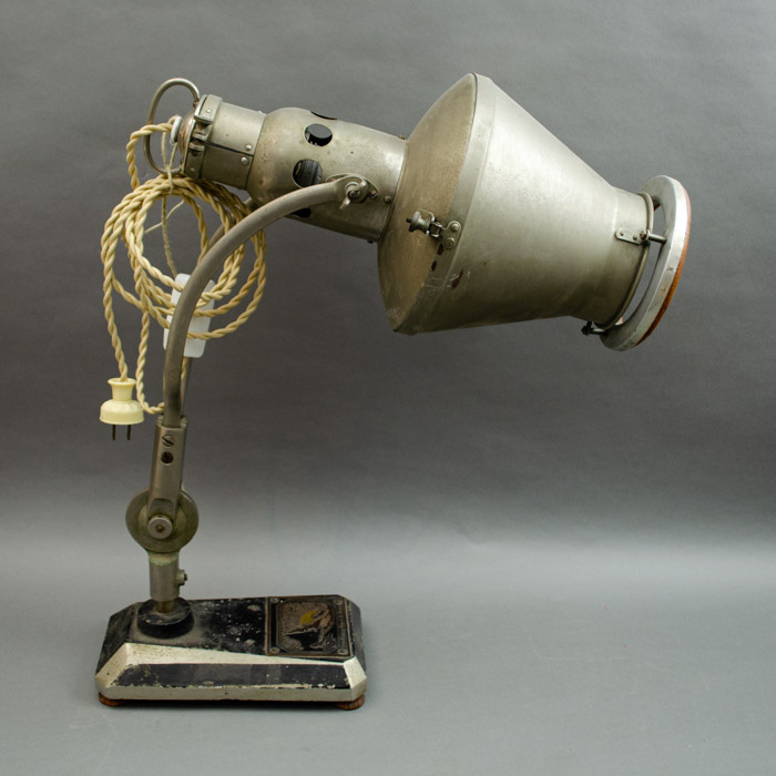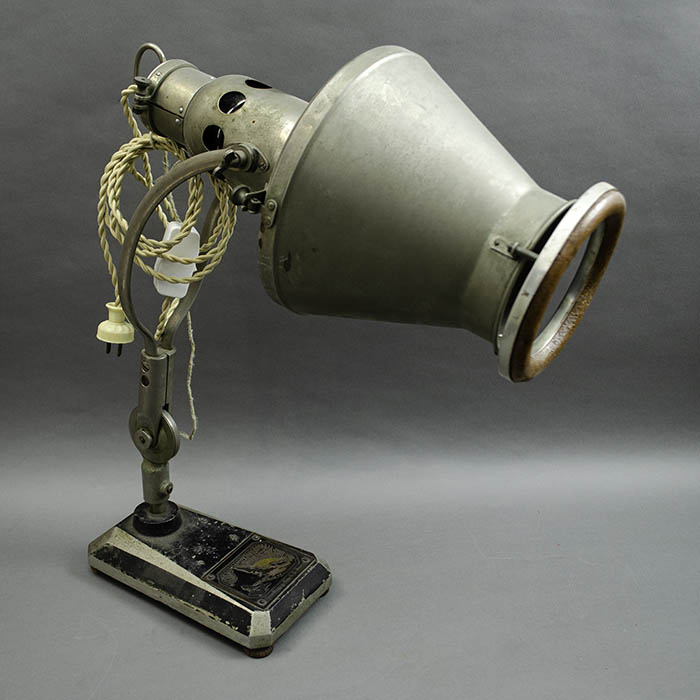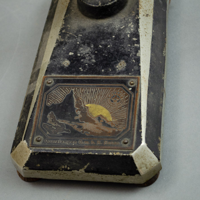 This lamp was manufactured by the Heraeus company in the town of Hanau, Germany. The iron base has the original company tag.  The company’s roots go back to a family pharmacy started in 1660. In the early 20th century, Heraeus invented the mercury vapor lamp, which subsequently led to the development of the tanning lamp. Today, Heraeus is a conglomerate still headquartered in Hanau that includes businesses in the environmental, electronics, health, and industrial applications sectors.