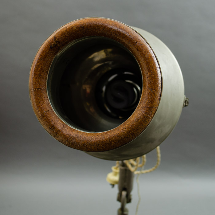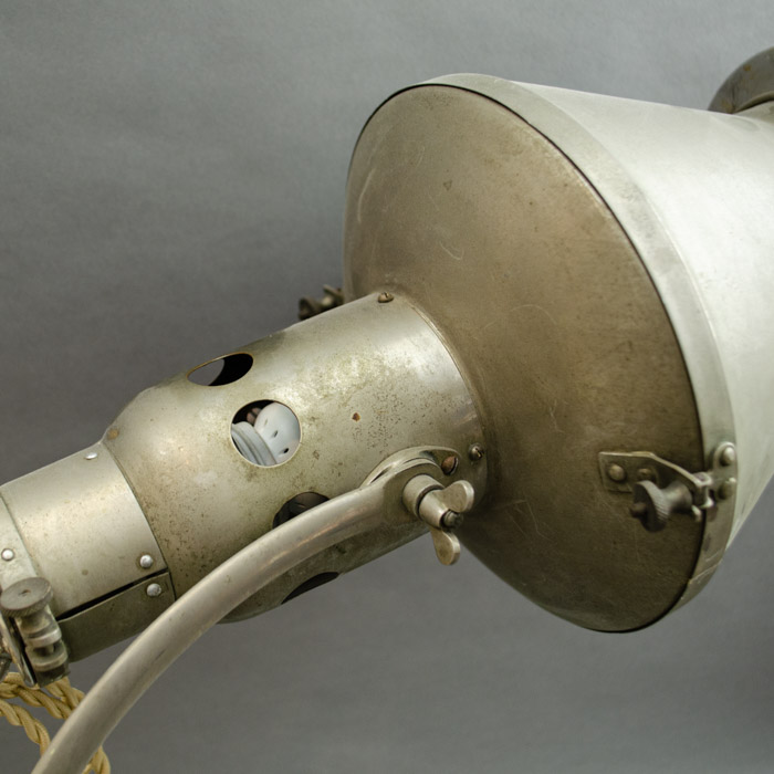 An adjustable modernist lamp, originally intended as a therapeutic heat lamp, now converted to standard desk lamp use. The shade rotates 360 degrees sideways and at different angles pointing up or down. Overall the lamp has an industrial, “steampunk” look, well suited for a modern interior.