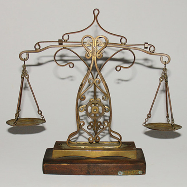 Brass balance pan scales, of typical form, on a rectangular wooden base. The scales are made of intricate cut brass, with numerous scroll patterns and incorporating gear motifs. A brass identification plate “Allievi” — probably the designer or manufacturer — is affixed to the front edge of the base. The surname Allievi is generally Italian or Spanish; the scales were purchased from an antique dealer in Buenos Aires, Argentina. They are an ideal small size for shelf or desk decoration in a library and would make an excellent gift as scales of justice for a lawyer.