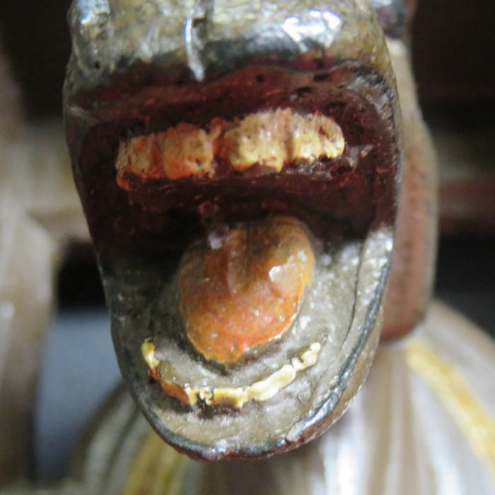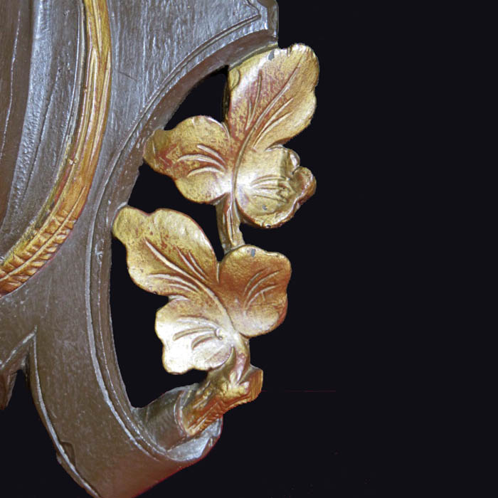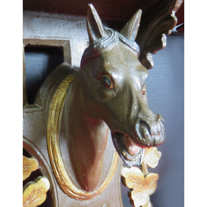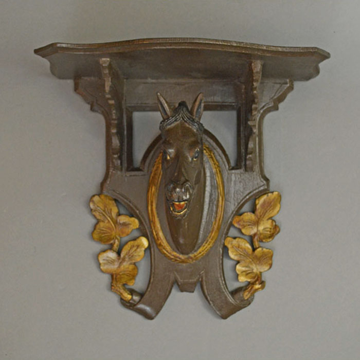 A pair of wall bracket hanging shelves, each with a shaped shelf and a cartouche back panel with gilt leaf design centered on a protruding horse head, whimsically portrayed with bright eyes and an open mouth showing its teeth.