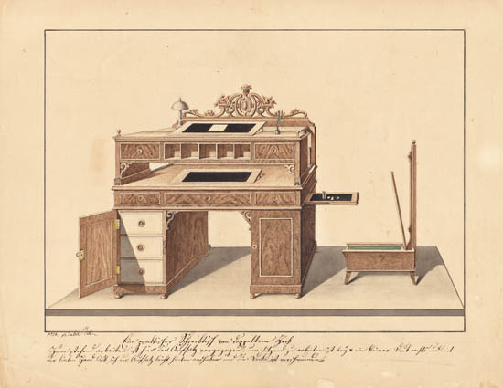 Pair of original designs for elaborately constructed wood writing desks or secretaries in the Biedermeier style by the German furniture maker and designer Wilhelm Kimbel. The designs, one vertical and one horizontal, feature clever arrangements of shelves, drawers, cubbyholes and fold-out writing surfaces. They are decorated with curving scrollwork and marquetry. The vertical desk also incorporates a clock at the top and neoclassical columns. Both paintings are surrounded by ruled pen-and-ink borders and have descriptions written in ink in the lower margin, apparently in Kimbel’s hand.